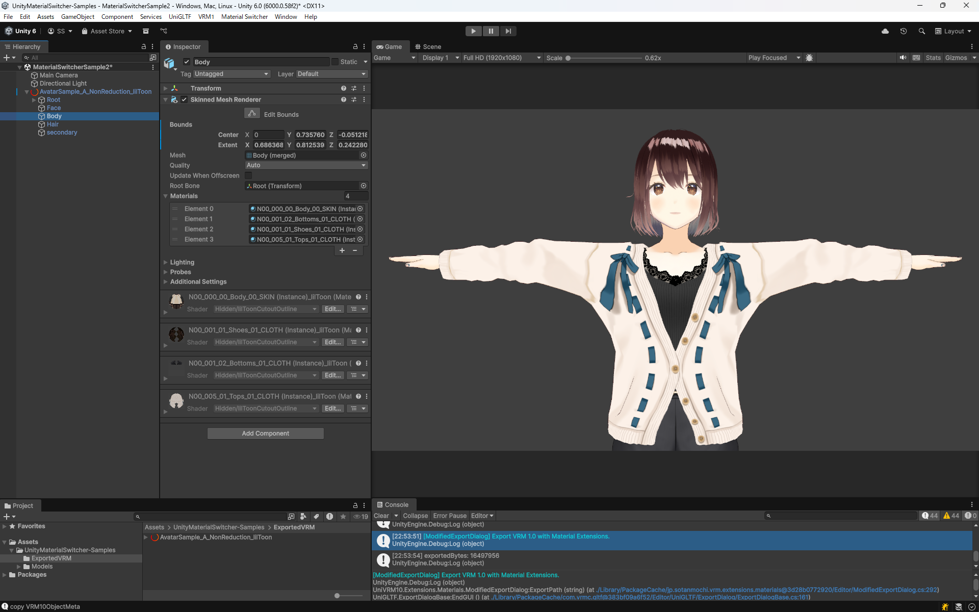 lilToonのマテリアル情報(シェーダープロパティ、テクスチャなど)がVRMファイルの拡張データとして含まれた状態でエクスポートされます。